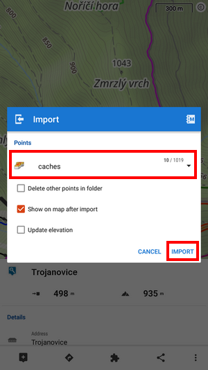 This way the app imports 20 geocaches placed around the maps screen cursor. You can change the location, and number of caches, or set up a filter. More info >>