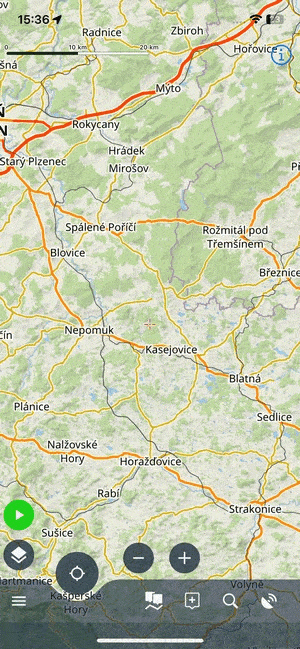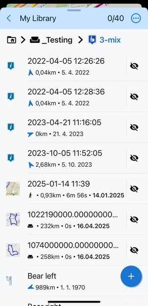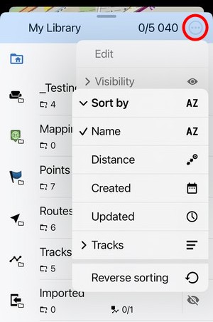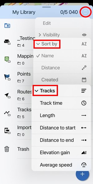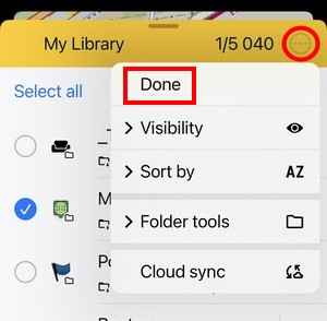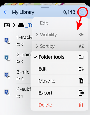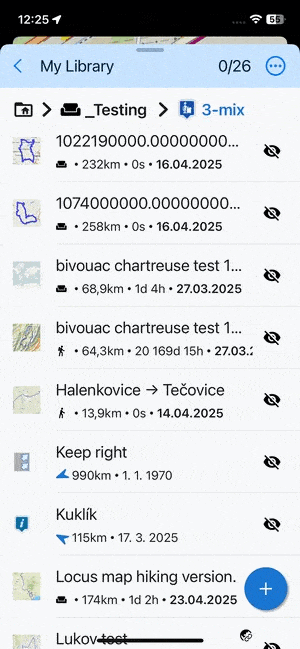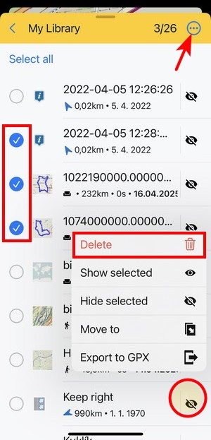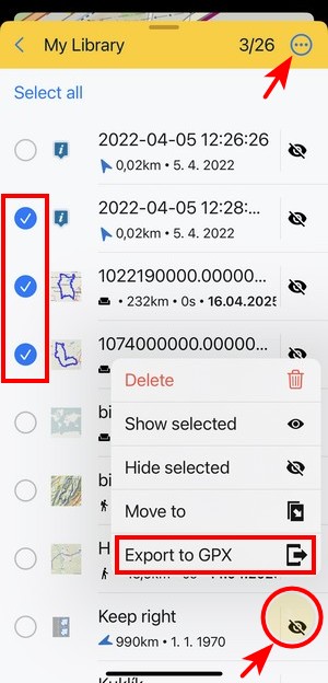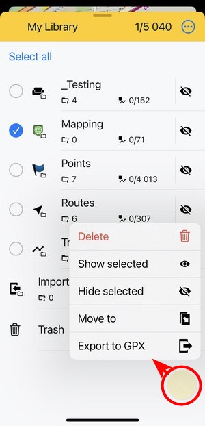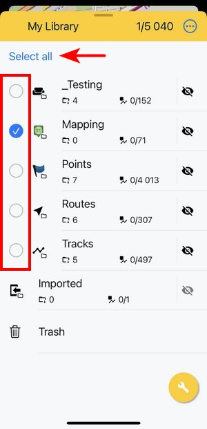Edit turns the screen into editing and multi-selection mode. The topbar displays the number of selected subfolders, points and tracks/routes. Checkboxes emerge on the left side. Checking them marks the items for one of many mass-editing activities. You can select all items at once by tapping Select all: