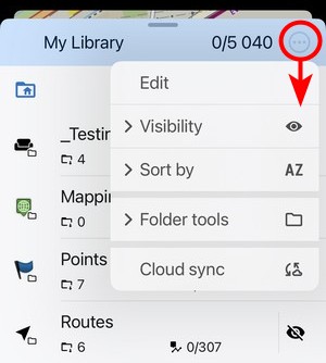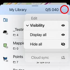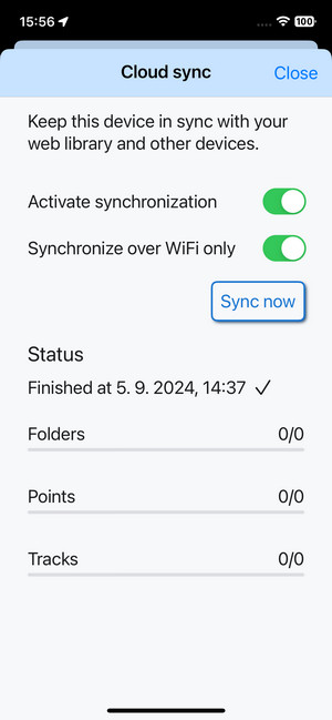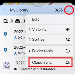 By default, Locus Map LITE is synchronized with the apps on other devices and the web library automatically. To check the status or to trigger the sync manually, tap the button in the library menu: