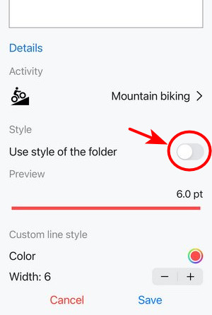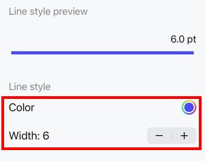 The line sample shows what the tracks and routes stored in this folder will look like. To change the color and width, use the controls: