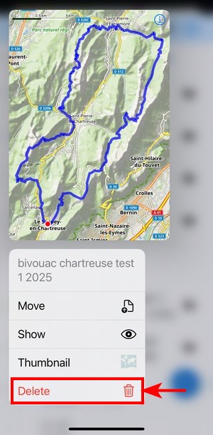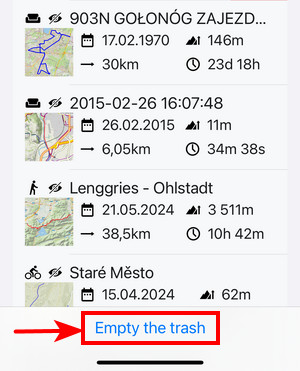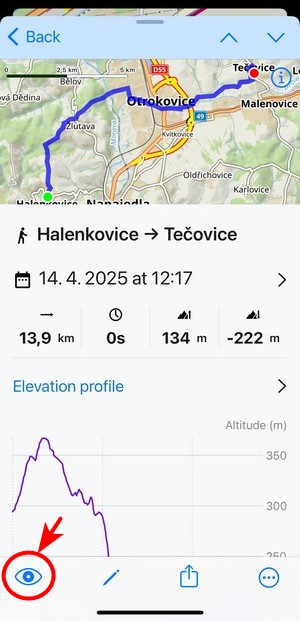 To display a selected track/route or point on the map, use the eye button. You can find it both in an open folder:
