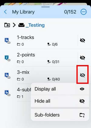 Each folder line consists of an icon, a folder name, a number of subfolders, a number of items displayed/hidden on the map, and the eye button, controlling content visibility on the map.