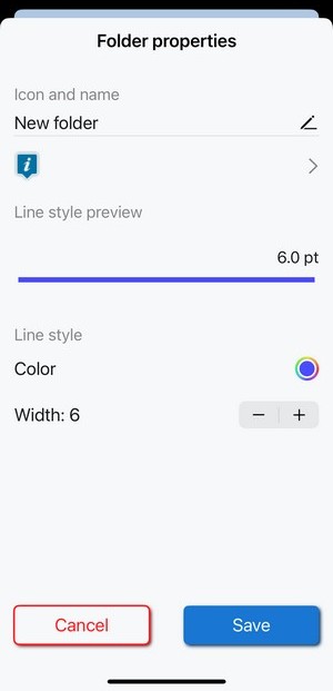 Tapping Edit opens a dialog in which you can change the parameters of the folder - the icon, name and style on the map. The parameters are described in detail in the Add new folder paragraph.