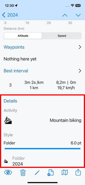 Information about the activity on the track (or planned route), the style of the track line and the folder where it is stored: