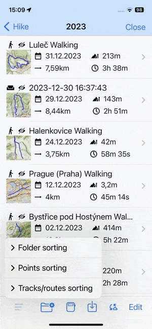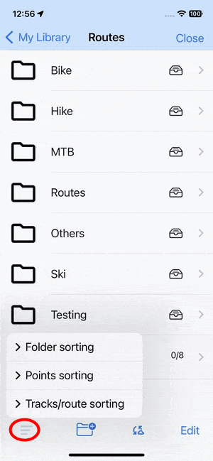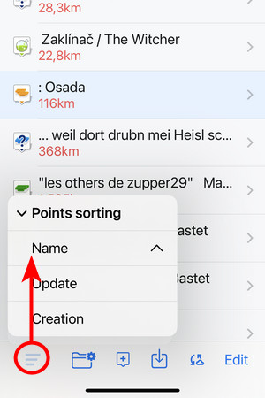 Tracks and routes can be sorted in the folder by various criteria - by name, distance, time, date of creation, and date of update. To change the criterion: