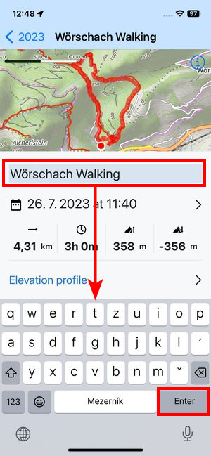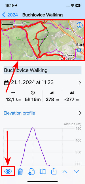 When you tap a track or route in the library or on the map, its detail screen emerges: