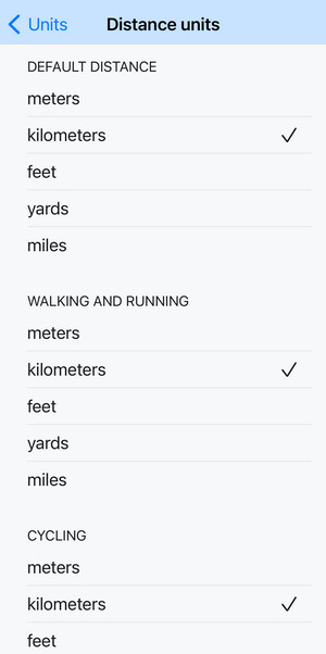 Distance units can be set individually for various activities - default, walking and running, cycling, swimming, etc.