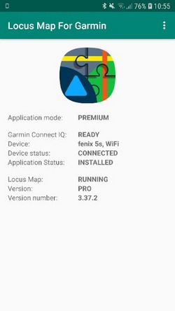 This application has to be installed on your phone to provide communication between Locus Map mobile outdoor navigation in your phone or tablet and Locus Map in your Garmin device via Bluetooth. It does not work without main Locus Map app. The application further requires Garmin Connect Mobile installed on your phone.