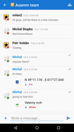 When live chatting, you can send not only messages but also places - coordinates, points of interest, geocaches… Just select from the location selector.