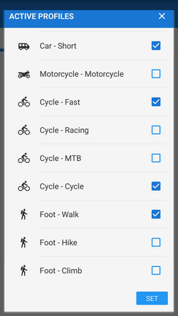 Next step is to choose sports activity or means of transport an route (aka navigation profile). The selection depends on used routing services.