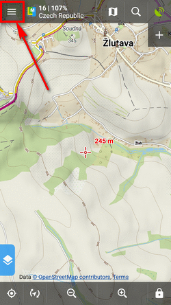 After tapping the START button, the navigation panel and control menu are displayed:
