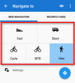Next step is to choose sports activity or means of transport an route (aka navigation profile). The selection depends on used routing services.