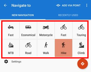 The next step is to choose sports activity or means of transport an route (aka navigation profile). The selection depends on used routing services.