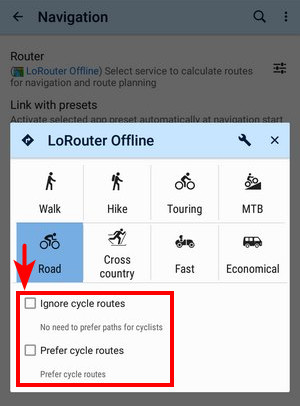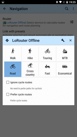 Here you can set up the default service for calculating routes for Navigate to feature and the Route planner. Locus has its own service LoRouter but it can also cooperate with external routers. Each service has specific properties, some are functional online only, and some work offline (after downloading offline navigation data).