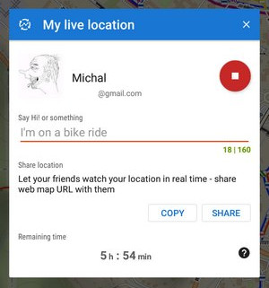 With this, you can share your location continuously in real-time with anybody who has access to the internet. It shares a URL leading to a microsite where your location is displayed on a map and updated every 15 seconds.