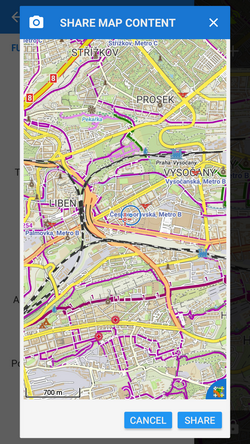 A very simple method of sending your device screenshot to your friends. The feature captures a shot of the whole map screen with all displayed objects - points, tracks, etc. - without controlling buttons. Then Locus calls all available apps that can share the image