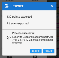 Creates a .kmz file with all visible map content for displaying in any .kml/kmz-supporting software (e.g. Google Earth) and saves it in Locus/export directory in your device: