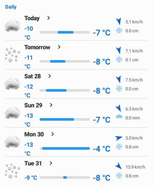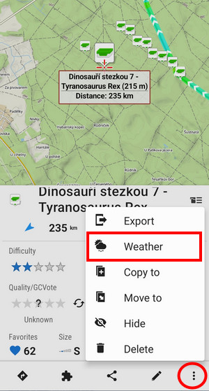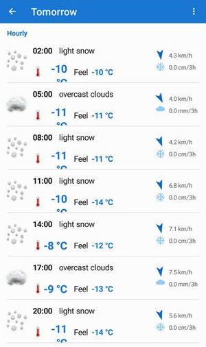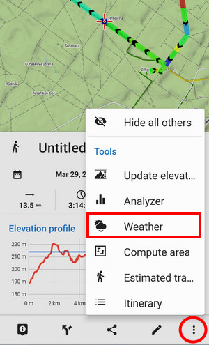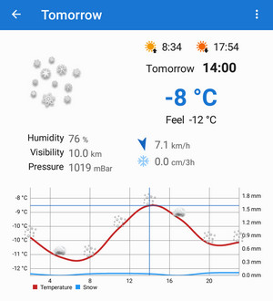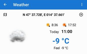 Locus Map offers a 16-days worldwide weather forecast. And a detailed 3-hour forecast for the first six days. For any place on Earth, it provides information on temperature, precipitation, probability of precipitation, humidity, visibility, pressure, wind speed and direction, and sunrise/sunset times in local time. All data is provided by OpenWeatherMap.
