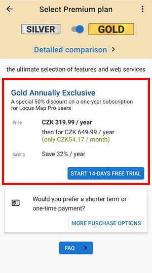 After signing up or in the Locus account, choose your plan - Silver or Gold. Premium annual subscription is the default choice: