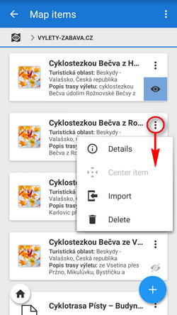 • permanent import - select Import from the item action menu, Locus Map screens the imported file and designs the import dialog according to its content - points, tracks or both. Then the process goes on like in the points or track import and imported objects appear on the map and in the folder structure of point resp. track tabs of the Data manager.