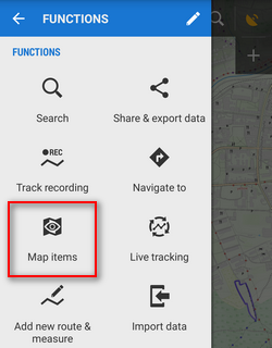 temporary activation - by tapping the name of an item you can load it, i.e. make it visible on the map. The name changes color into red and the item is placed above the map. The item content unpacks to the application temporary directory to display or work with. It is possible to unpack more files at once. Re-tapping reverses this procedure and all changes are discarded. Some items can be temporarily activated also by an ordinary import with the option “Only display” checked. All temporarily activated objects can be removed by the Clear button.