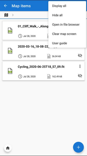 Map items screen contains list of folders and items. Folders are created 1) automatically during a particular process, e.g. linking files from certain web services or features, e.g. map calibration. 2) other folders have to be created externally in /Locus/mapItems directory via a file manager of the device.