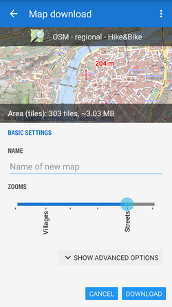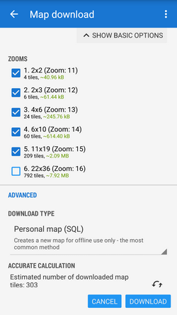 The Advanced options menu offers accurate calculation of the final amount of map tiles which is especially useful when downloading paid commercial maps. Then there is an option to set the download type: