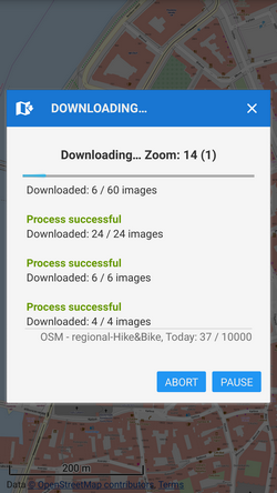 A downloading progress info box emerges after the download is launched. Besides useful information, it offers to abort the downloading process (and lose all already downloaded data without the possibility to restore the process) or pause it - then the already downloaded data is saved and the process can be renewed from the main download dialog box.