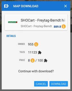 In case you download a paid map Locus Map displays another dialog. It summarizes your LoCoin credit, the final price of the downloaded map, the number of tiles in the packet, and the price of 100 tiles. If you have enough credit for the purchase there is no other obstruction to begin downloading.