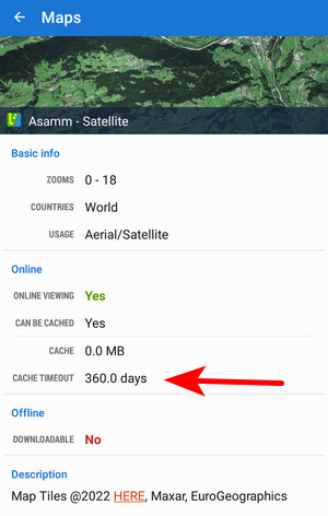 A typical case is an online LoMap which can be cached for 90 days and the base Satellite map which can be stored in the cache for up to one year. The cache timeout of each online map is displayed in its description: