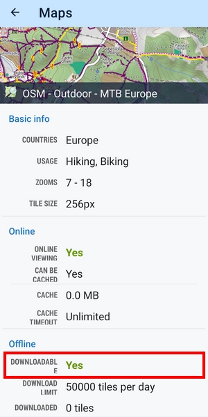 Some of the online maps from external providers can be downloaded for offline use (you can check the availability in the map detail):