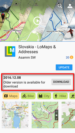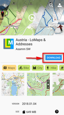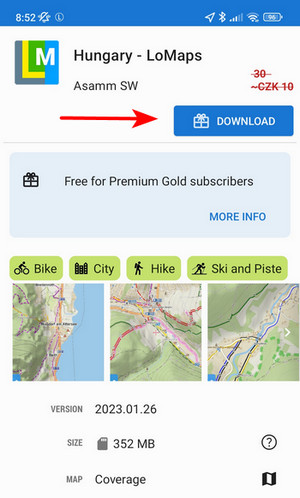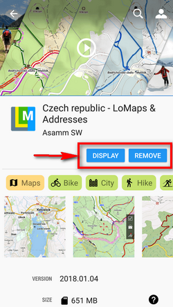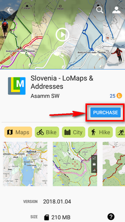 When you find your desired map, tap it to display its details. You can see the date of the map update on it (offline LoMaps are updated approx. once in two months) and its size in MB before and after unpacking. To start downloading tap PURCHASE or DOWNLOAD.