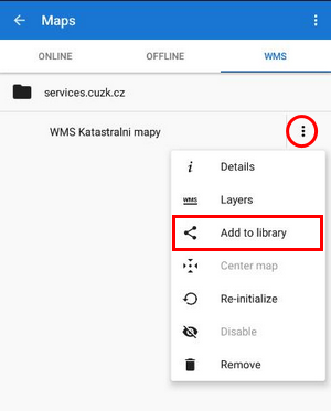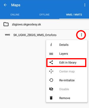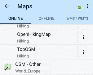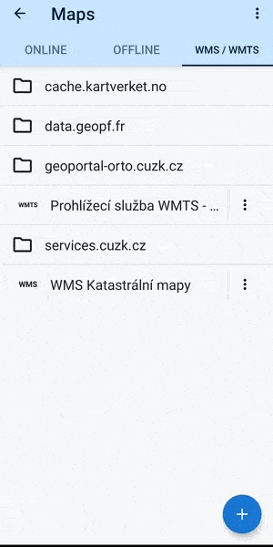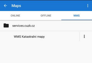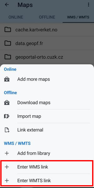 Map services are managed in the WMS/WMTS tab of Locus Map Manager. WMS/WMTS tab can be deactivated (invisible). To activate it, tap the manager action menu: