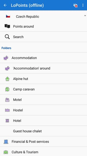 LoPoints are dynamic points of interest that can be displayed above any map. Each LoPoint marks the location and category of a particular place and contains additional information - e.g. opening hours, WWW, phone number, and other attributes. LoPoints can be navigated to and guided similarly to Locus user points. LoPoints are based on OpenStreetMap and Wikipedia data.