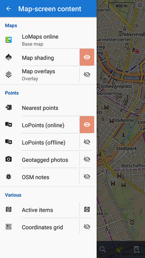 Offline LoPoints are an integral part of LoMaps but can be also displayed above any other map. They can be turned on/off from the content panel as well.