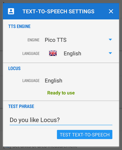 • Locus Map - currently set application language. It is important to have identical localization of your TTS engine and Locus Map so that TTS works properly. Otherwise you will be notified that the selected language is not supported.