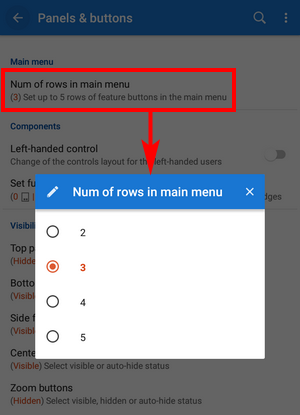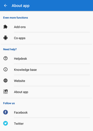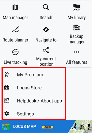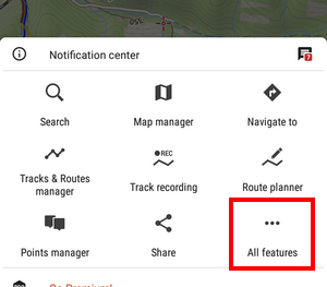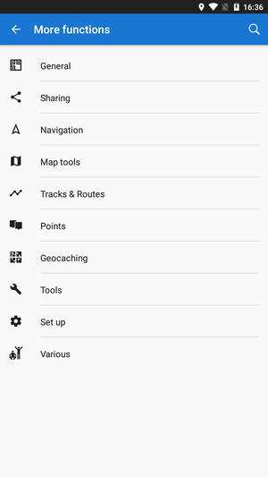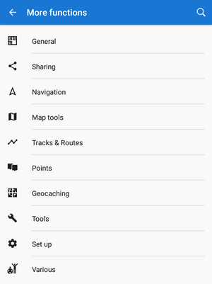 Opens a list of all features, tools and settings, available within the app, sorted into categories: