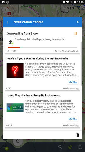 Here the app informs about ongoing processes - downloading maps, elevation data… and also news from our website (can be deactivated in the settings)