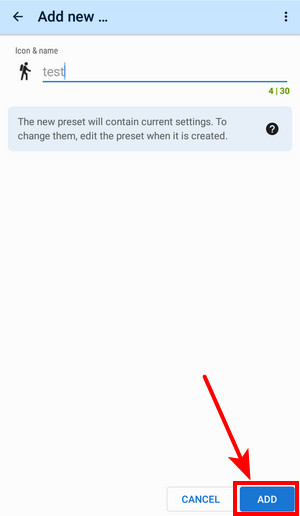 This creates a new preset containing the currently active app setup. Change its icon and title and tap ADD
