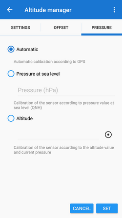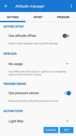 • Use pressure sensor - switches on measuring precise altitude by the device built-in barometric pressure sensor. More in the Pressure tab.