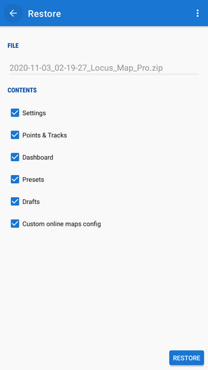 • Restore - shows content of /Locus/backup/ directory from which you can select a backup file to restore. In the case of a file with all backups, you are prompted to select what content of the package you want to restore.