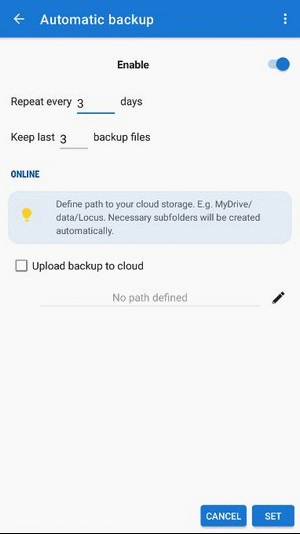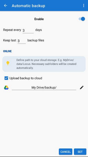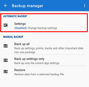… saves settings, points and tracks periodically to Locus/backup/auto directory and optionally to Dropbox, OneDrive or Google Drive. How to set it up:
