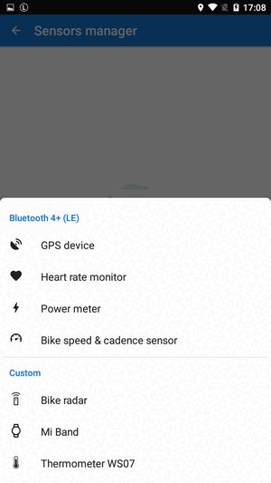 • tap in the manager and select type of connection - BT4, BT3, ANT+ or USB