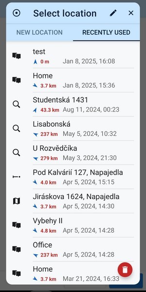 The tab contains the last used locations. The locations are listed according to time of use, the newest is at the top.