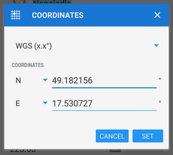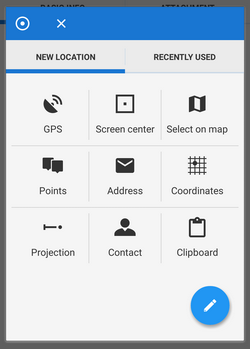 Coordinates - switches the Coordinates Edit Dialog to enter exact coordinatesThe grid can be modified - icons can be long-tapped and dragged to change position or removed, a new customized location point can be added, see Location Selector Setup »
