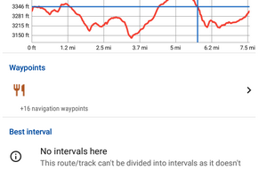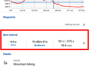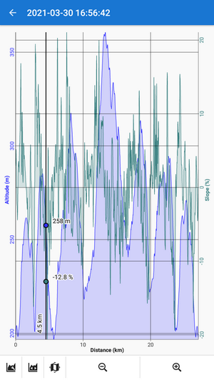 At first the panel is slid up only partially, showing the distance to the trackpoint and its elevation. The distance is a combination of the distance to the closest point of the track and then along the track to the selected trackpoint. Further sliding up shows full detail: