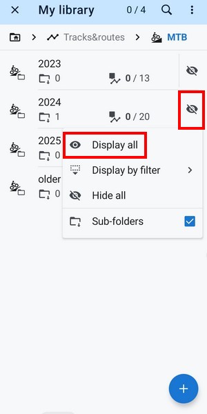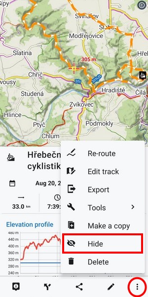 If you have many tracks or routes displayed on the map screen and you want to hide all of them but one, go to the detail screen of the track > bottom bar menu > tools > tap Hide all others. More info >>