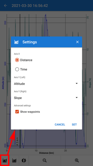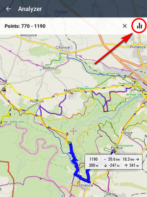 The elevation chart (4) displays the position of the tapped trackpoint. Maximizing button unfolds the chart to the more detailed version:
