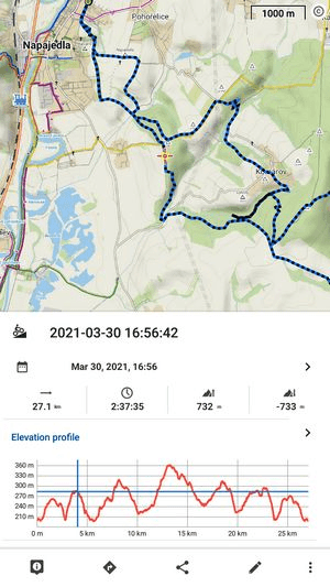 When you tap on a track/route in My Library folder, the detail panel emerges. The upper part is filled with a map preview of the track. Tapping the centering button opens the map screen with the track aligned in the center: