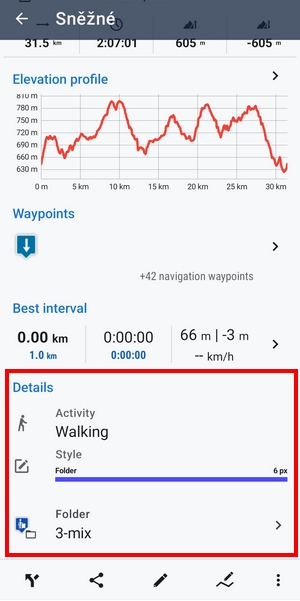 The lowest part of the panel displays the track/route details: its activity, line style and folder in which the track is stored: